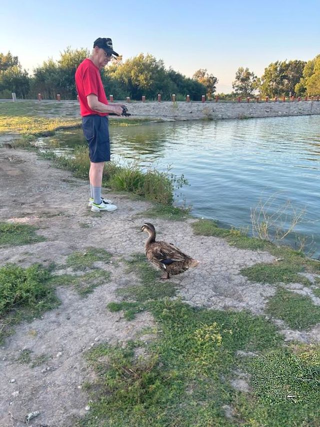 I tried casting all around that section of the lake. NOT even a bluegill nick! In the meantime, my grandson went back over to catch the big bass. I did see a female mallard trying to take her 10 chicks for a swim around the lake. Our trip was cut short for my grandson was notified he had a doctor s appointment, so we had to at 18:15. My grandson did manage to catch one small bass. I did not get one tap.